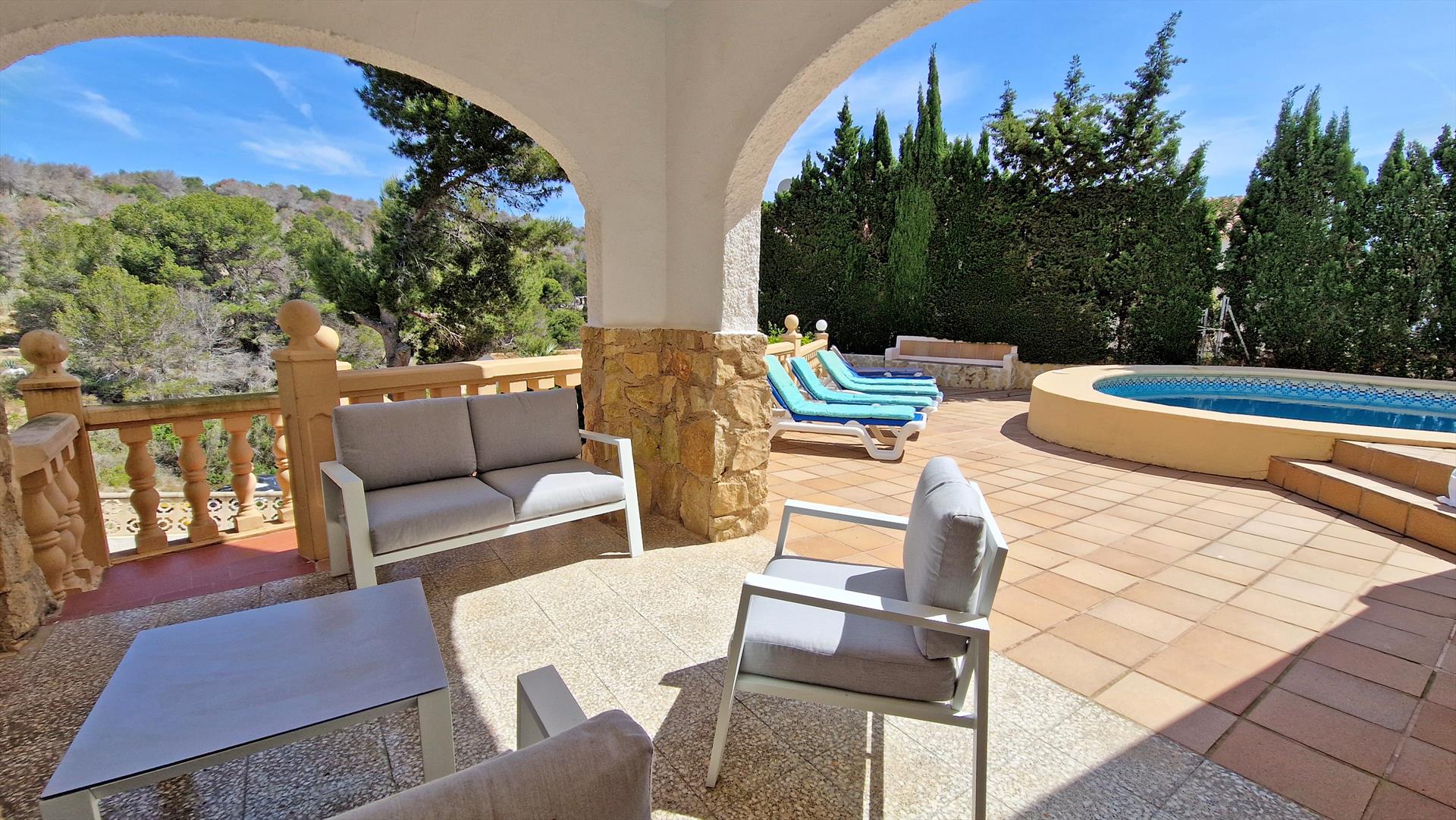 Amplia y clásica villa en Javea, Costa Blanca, España, con una piscina privada para 12 personas. La casa está situada en una zona residencial y montañosa cercana a la playa, a poca distancia de restaurantes y bares, y a 25 m de la playa de La Barraca Portixol.