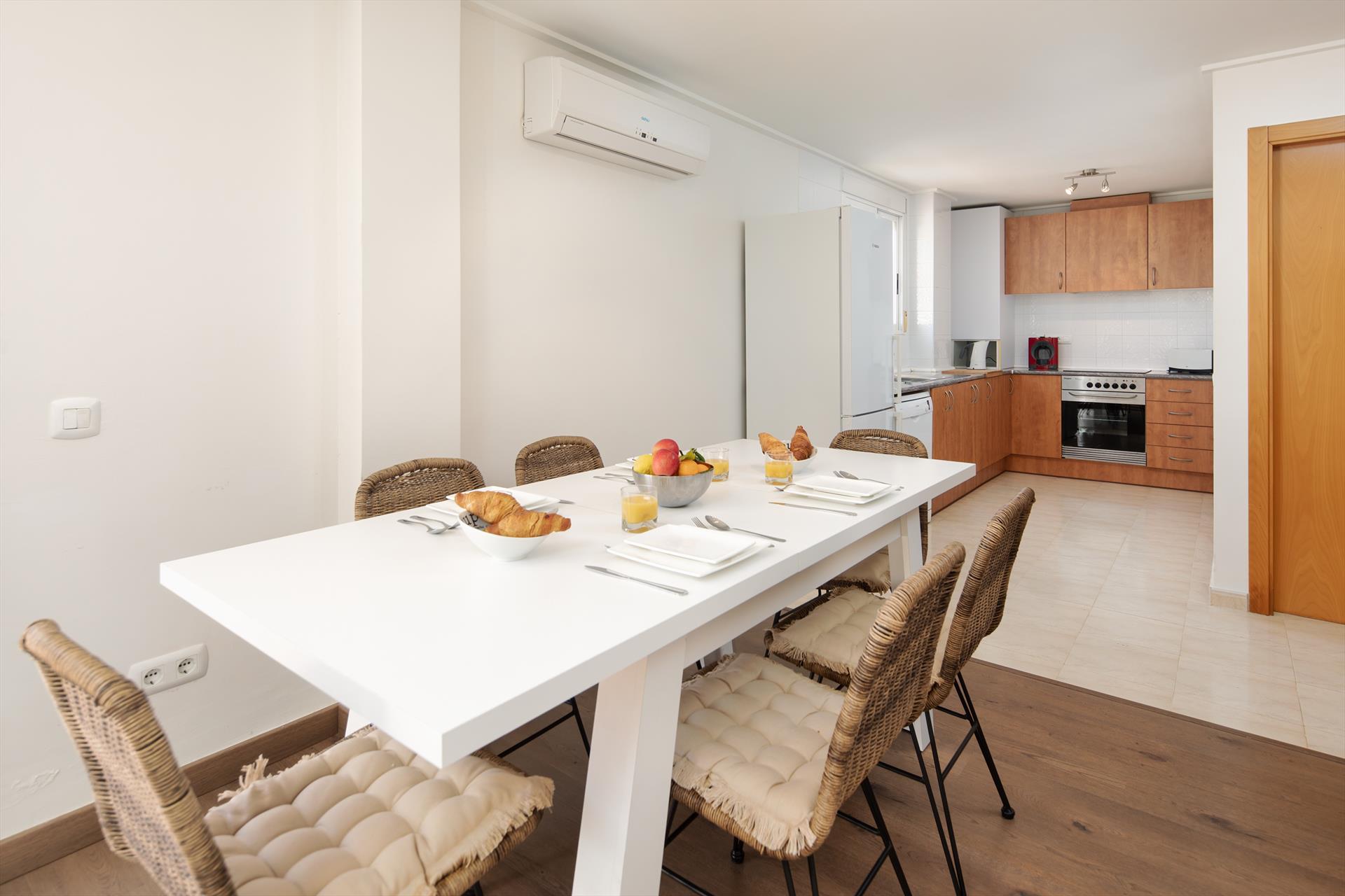 • cocina abierta con placa eléctrica, horno eléctrico, microondas, lavavajillas, frigorífico-congelador, cafetera, hervidor eléctrico y tostadora