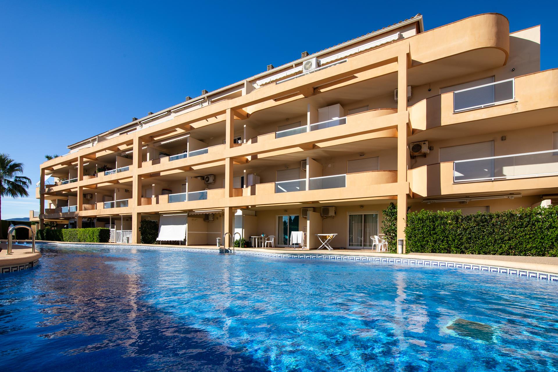 Hermoso y alegre ático en Denia, Costa Blanca, España, con piscina comunitaria para 6 personas. La casa está situada en una zona residencial de playa, cerca de restaurantes, bares y supermercados, y se encuentra a 500 m de la playa de Les Bovetes.