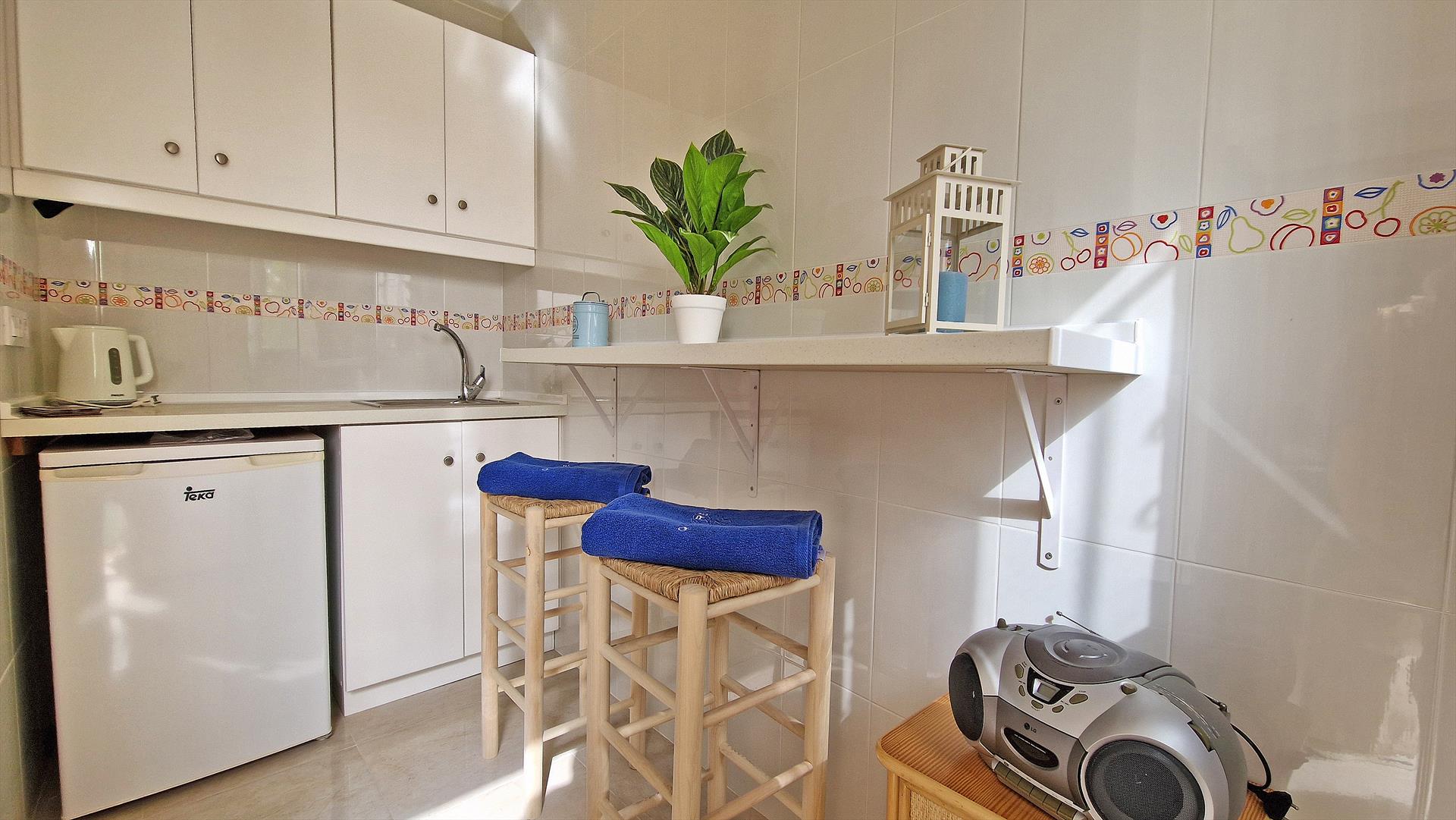 Interior: Frigorífico, encimera y horno o grill eléctrico, cafetera, tostadora, hervidor de agua, plancha y tabla de planchar, batidora.