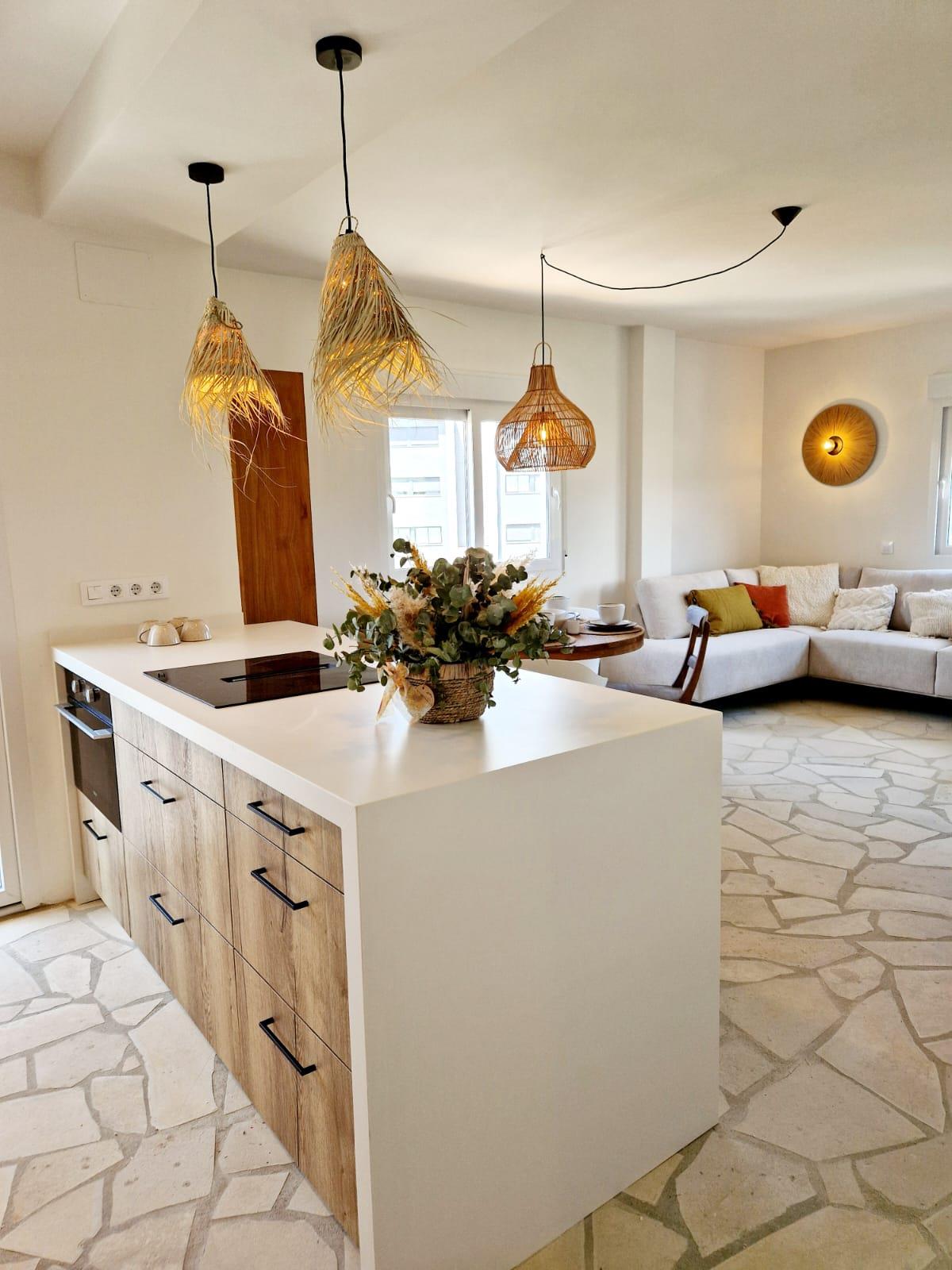 Este apartamento ofrece una combinación única de comodidades modernas y un ambiente moderno e ibicenco/boho. La espaciosa distribución ofrece amplio espacio habitable para 4 personas.