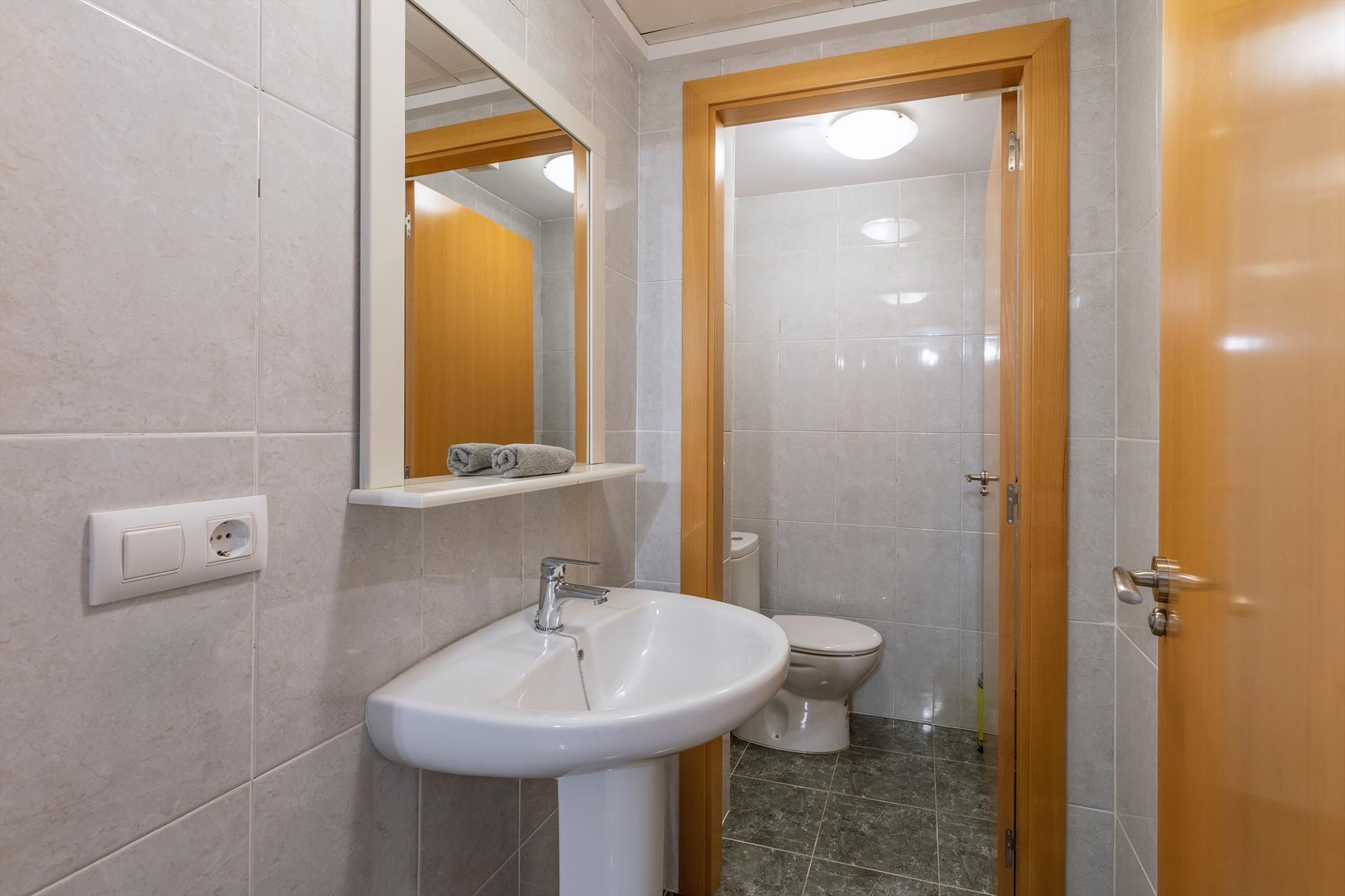 Arriba hay dos dormitorios, un cuarto de baño y dos terrazas. Un dormitorio tiene una cama doble, armarios empotrados y acceso a la terraza principal. El otro dormitorio tiene dos camas simples, armarios empotrados y acceso a una pequeña terraza. Todas las camas y colchones son "boxsprings" de buena calidad para un mayor comodidad para dormir. En el segundo dormitorio existe la posibilidad de poner una cama extra para un menor (bajo petición y con cargo adicional). El cuarto de baño tiene una ducha, aseo, lavabo y bidé.