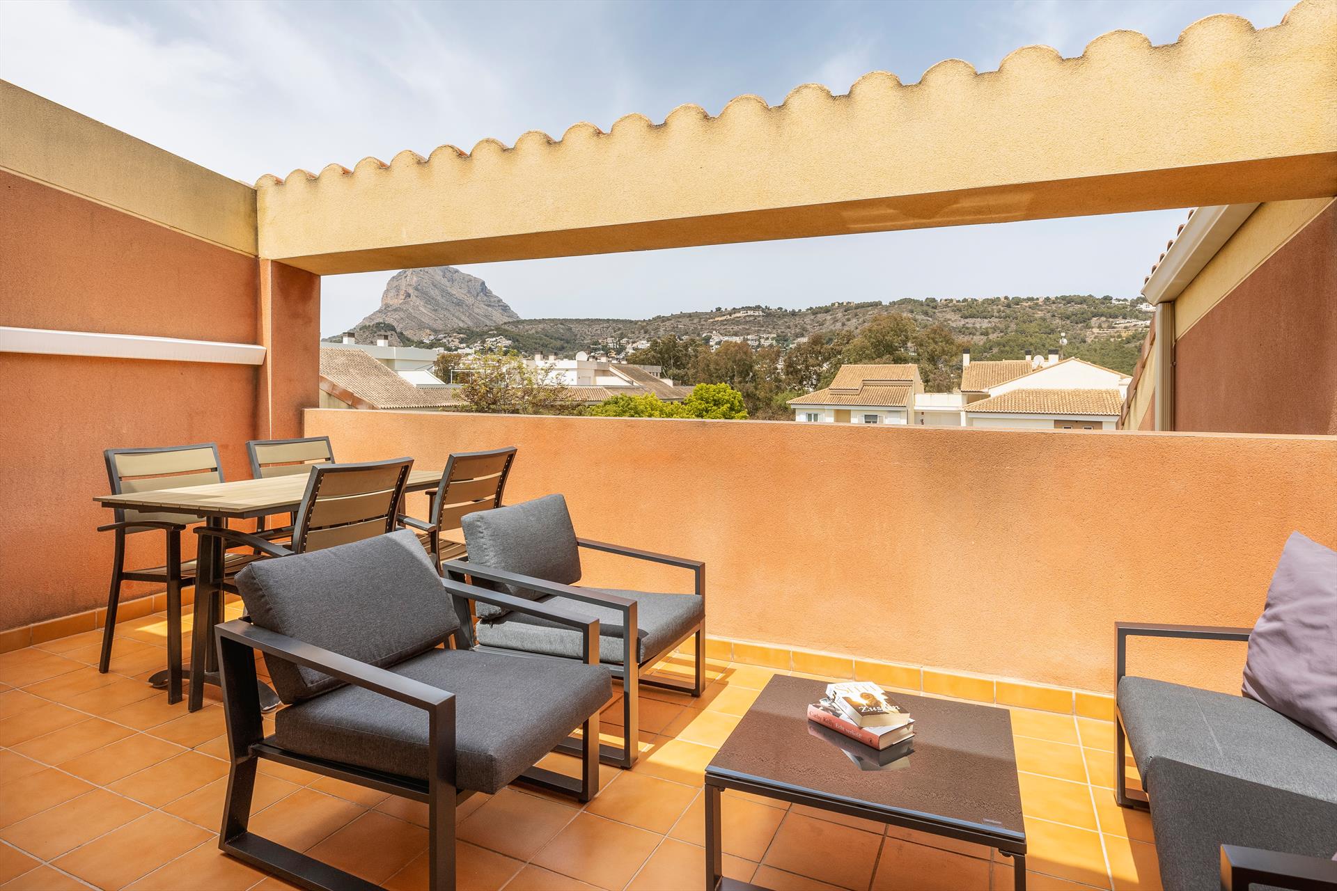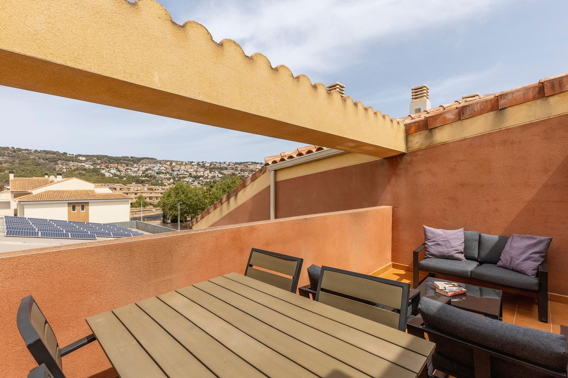 Arriba están también las terrazas. Al lado del dormitorio principal esta la terraza con sofá, sillas y una mesa para comer fuera. Aquí uno puede disfrutar las vistas a la montaña el Montgo con una copa de vino o tener una comida al aire libre. Al lado del otro dormitorio hay una terraza pequeña donde puede secar por ejemplo su ropa.
