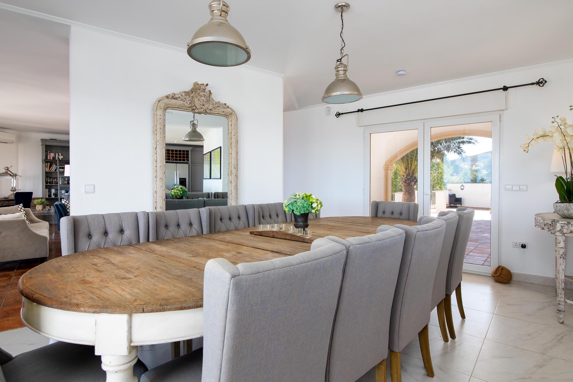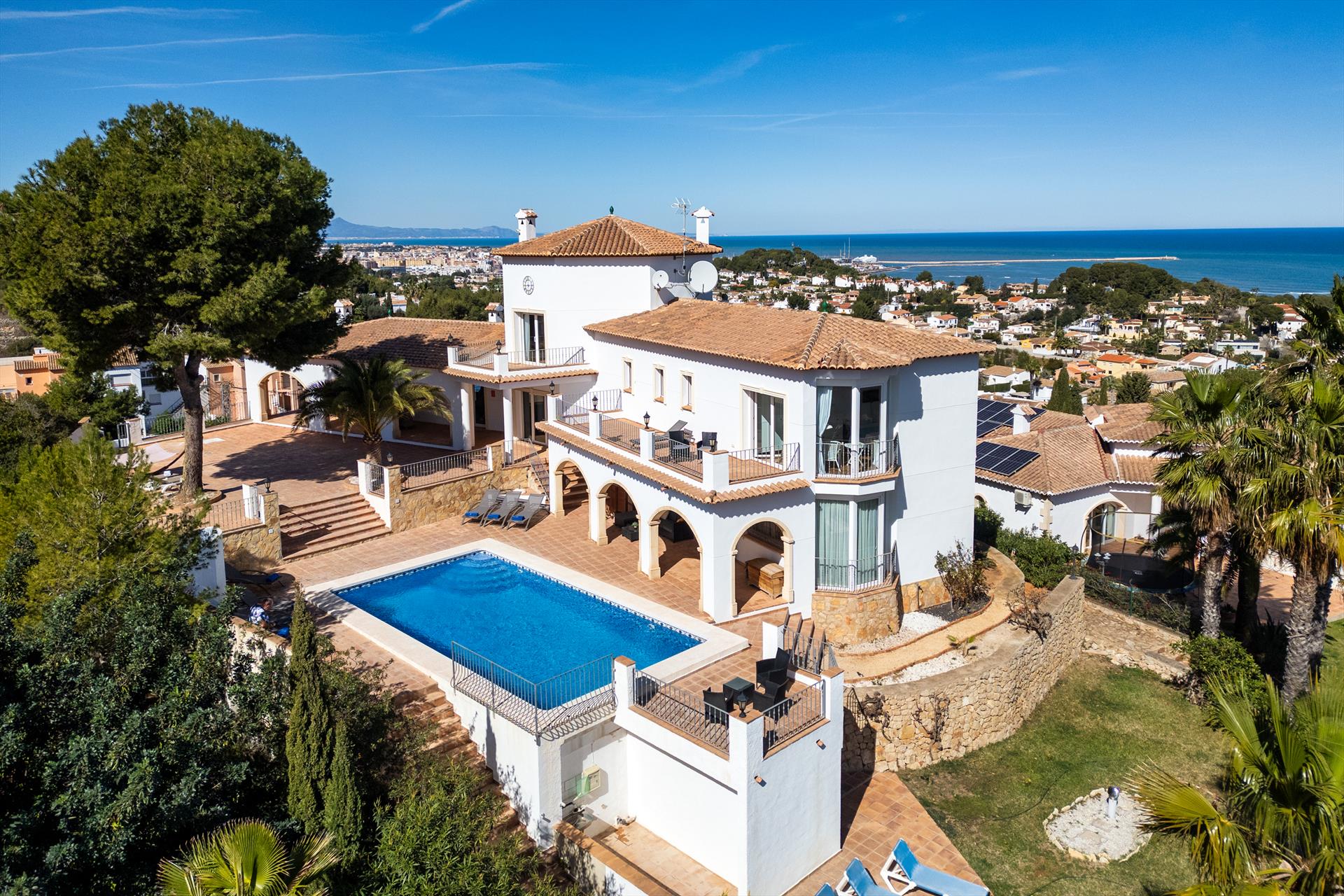 Große und luxuriöse Villa in Denia, Costa Blanca, Spanien, mit privatem Pool für 12 Personen. Die Villa befindet sich in einem städtischen und bergigen Strandgebiet, 3 km vom Strand Marineta Cassiana und 3 km vom Stadtzentrum Denias entfernt.