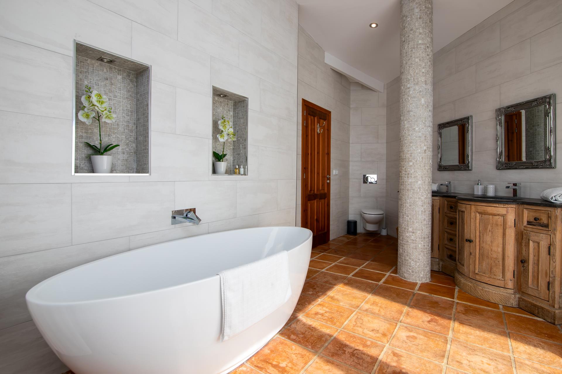 • Eigenes Badezimmer mit Doppelwaschbecken, Badewanne, Dusche, Toilette und Haartrockner