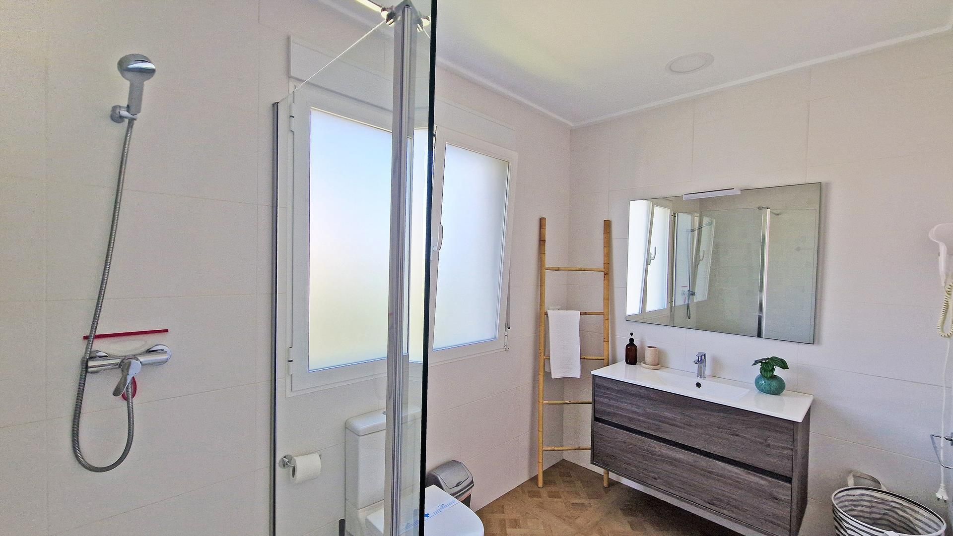 • Badezimmer mit Einzelwaschbecken, Dusche, WC und Haartrockner