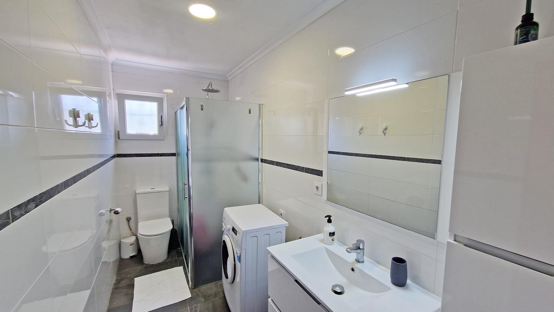 • bathroom with single washbasin, shower, toilet, and hairdryer