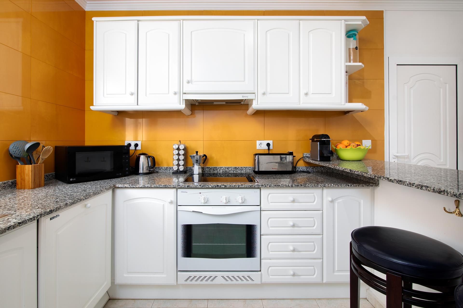 • keuken met elektrische kookplaat, elektrische oven, magnetron, vaatwasser, koelkast, koffiezetapparaat, waterkoker en toaster